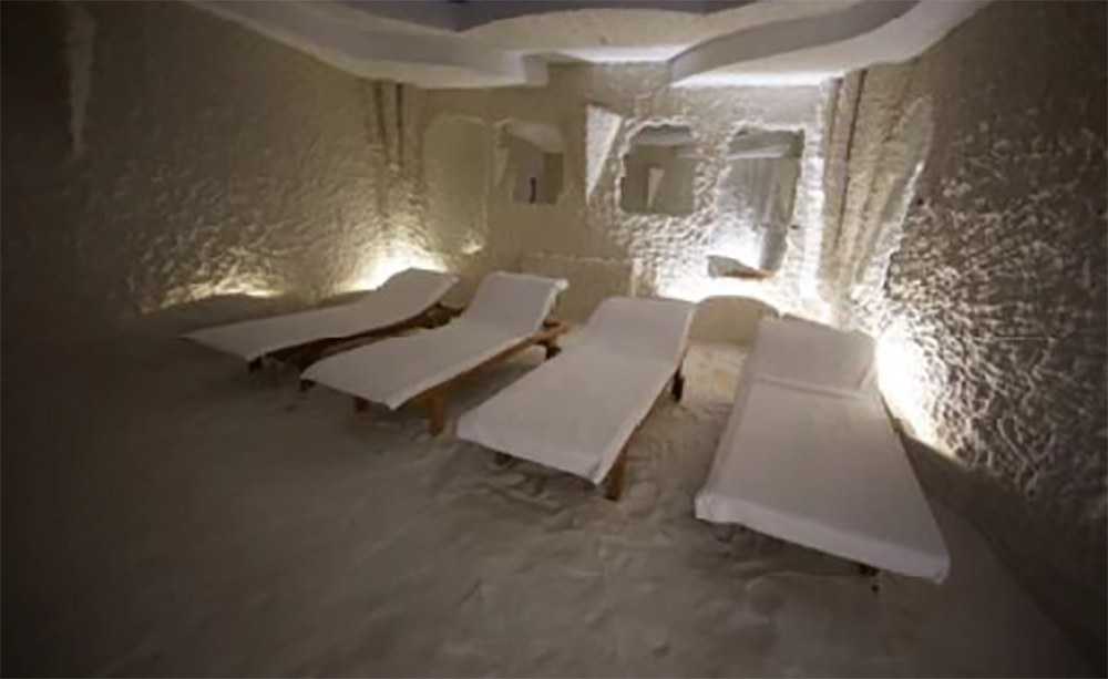 Breathing in air rich with natural salt particles to cleanse the respiratory system, improve skin health, and promote relaxation.
